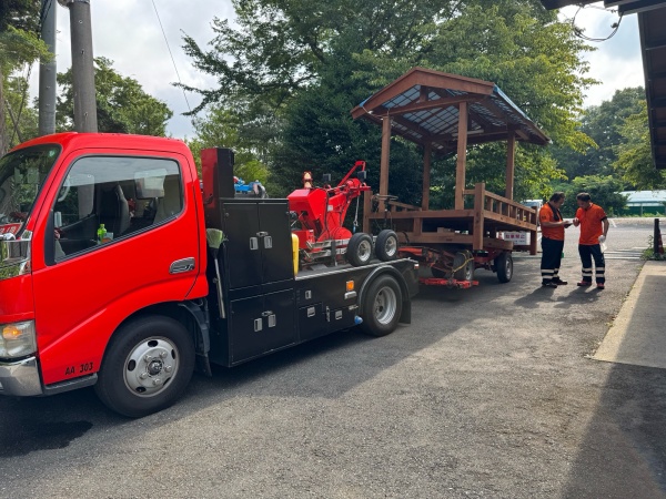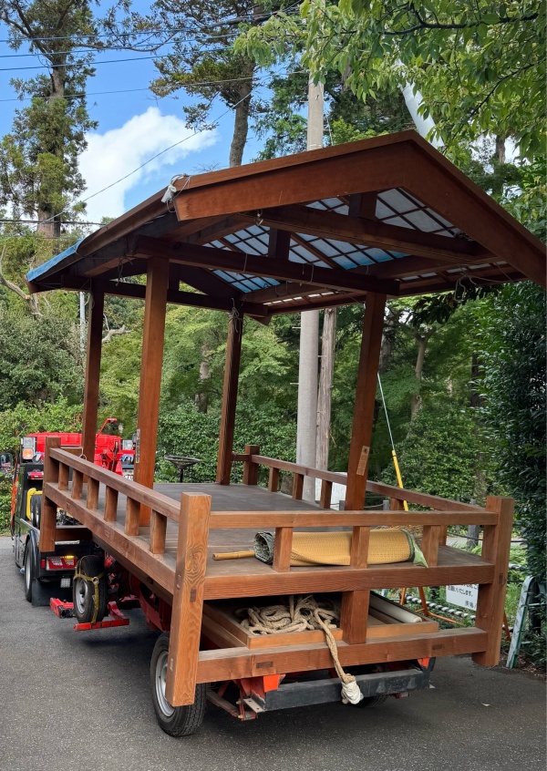 ”山車”を盆踊り大会の場所まで移動させてほしいというもの。私共は自動車を運ぶプロですが山車は一度も運んだことがありません😕
